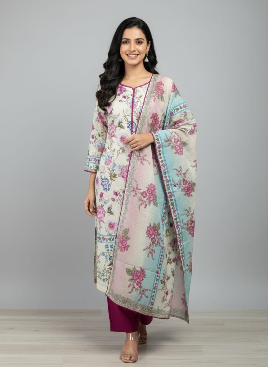 • Dupatta: Lightweight, full-length matching printed dupatta.